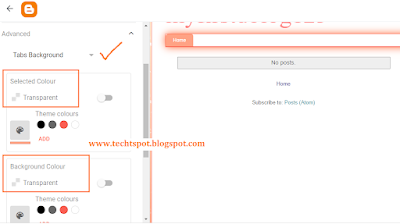 Step 7: Here Tabs Text option is the main menu bar which is visible in the blog header section, the first option is font family and size and the second is the text colour which is visible in your menu bar, the third option is selected colour that means when you click any of Tab then the selected tab get your choose colour.